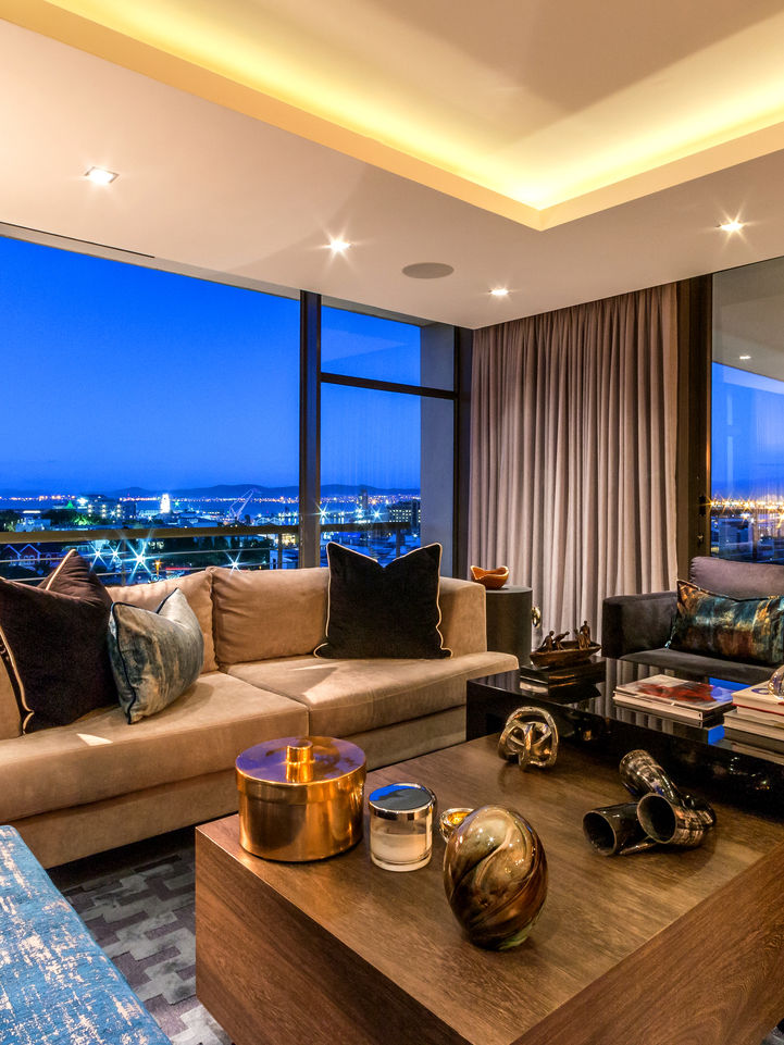 The living area is designed around spectacular views of the V&A Waterfront, with plush seating perfectly positioned to take in the scenery. Layered textures, modern accessories, and curated art pieces bring warmth and character, while soft evening lighting transforms the space into an inviting retreat for relaxation or entertaining.