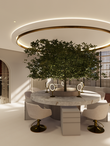 Upon entry, guests are greeted by a sophisticated hospitality area featuring a marble island, bespoke lighting, and comfortable seating. This inviting space sets the tone for a premium client experience, perfect for informal gatherings or refreshment breaks.
